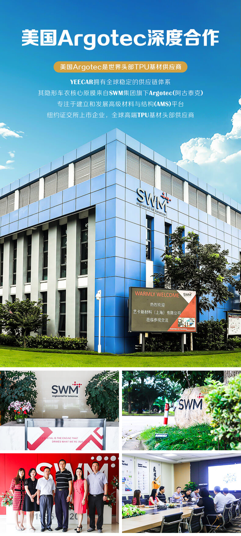 YEECAR与全球三大漆面膜生厂商之一的SWM集团旗下Argotec(阿古泰克)深度合作,隐形车衣核心原膜来自TPU头部供应商Argotec,跟市场上高端膜同品质,化学性质更稳定,具有高抗撕裂度、高韧性、耐黄变的性能。同时YEECAR研发团队汇聚了中、英、美、日、德等国科研团队成果,深入高温、泥石、暴雨、山地等极端环境,不断进行精准的数据测试和验证,研发出最适合各种极端环境的产品。让每位车主都能享受科技带来的驾乘乐趣,以优质产品和高品质服务理念,为您带来尊贵的汽车生活之旅。