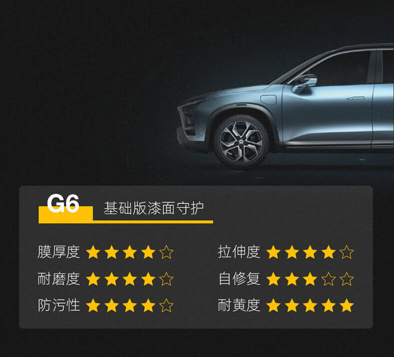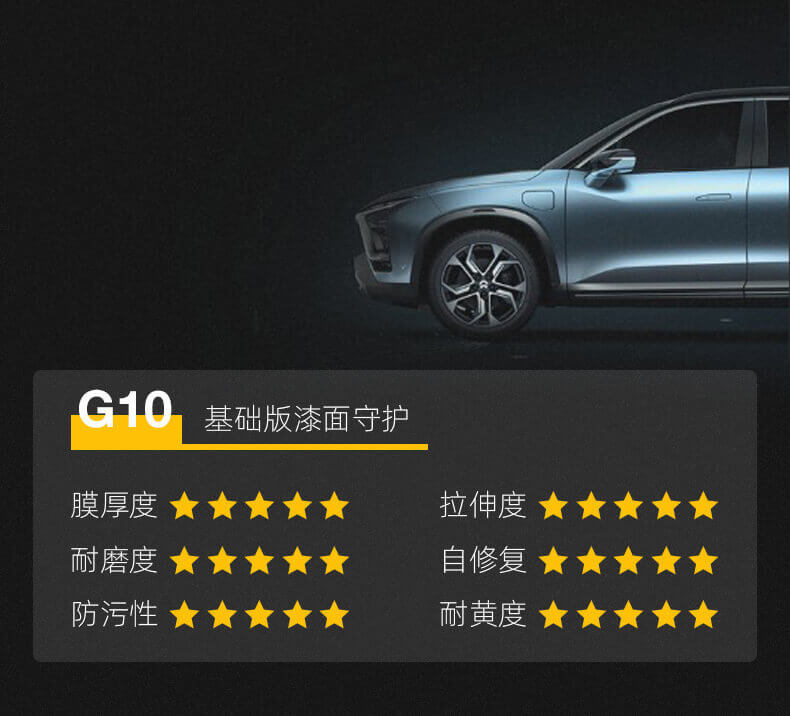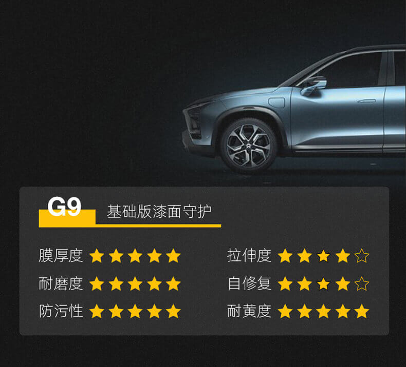 G9系列同时拥有优质的脂肪族TPU基材,致密的顶涂层技术,在确保强大的抗刮性能下,G9系列的抗污抗腐能力更突出,是YEECAR车衣中的明星产品,官方提供厂商级质保。