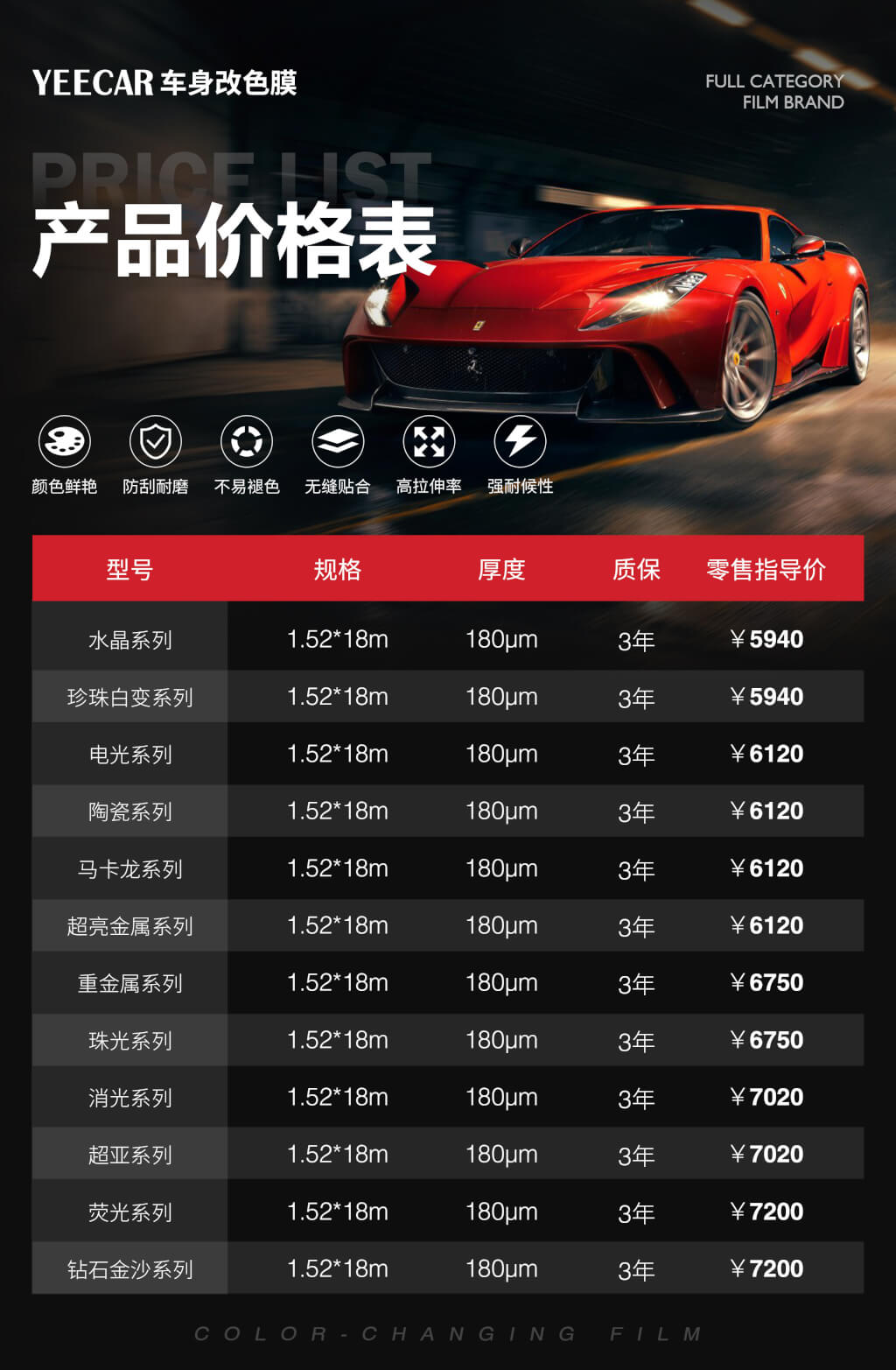YEECAR改色膜除了亮色的仿漆面改色膜,还有哑光膜、变色膜、电镀膜、夜光膜等多种改色、可以根据车主的喜好改变车身的颜色,满足不同车主追求个性潮流的需求,在人群中彰显时尚。