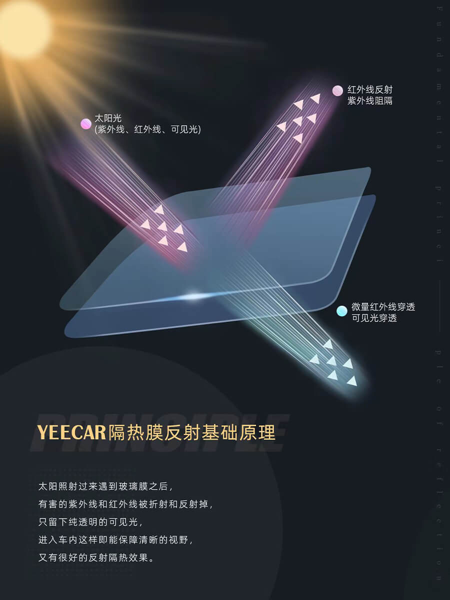1.YEECAR 汽车膜利用光学原理反射隔热,智能分割光谱带,纳米分子筛选可通过分子,隔热的同时以更加通畅。
