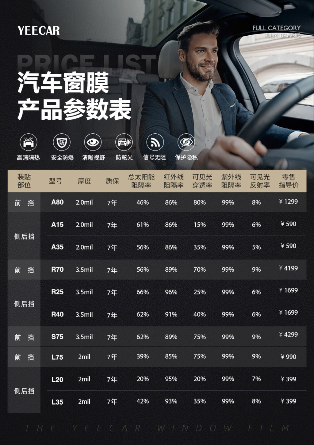 L系列 :前挡L75+侧后挡L20/35,前挡太阳能总阻隔率39% ,透光率75%;侧后挡最大太阳能总阻隔率50%,最大透光率35%