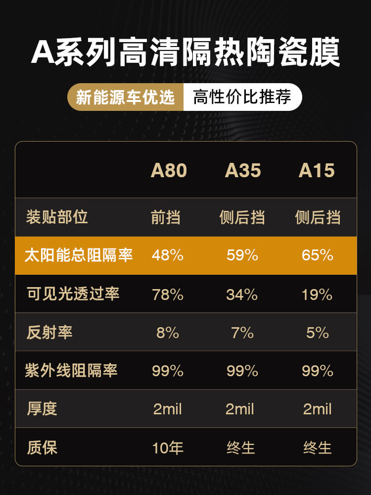 许多车友贴窗膜是为了保护个人隐形,尤其是汽车的侧后挡车窗玻璃,需要用车膜遮挡部分光线,在车内也能拥有个人空间。YEECAR艺卡窗膜A系列为车主配备了高隐私A15和低隐私A35,两种透光率可选,需要亮一点的可配备A15,可见光透光率为34%,窗膜颜色偏浅;对隐形要求高的车主可选A15,可见光透光率只有15%,深色窗膜,高效保护私密空间,让出行更舒心。