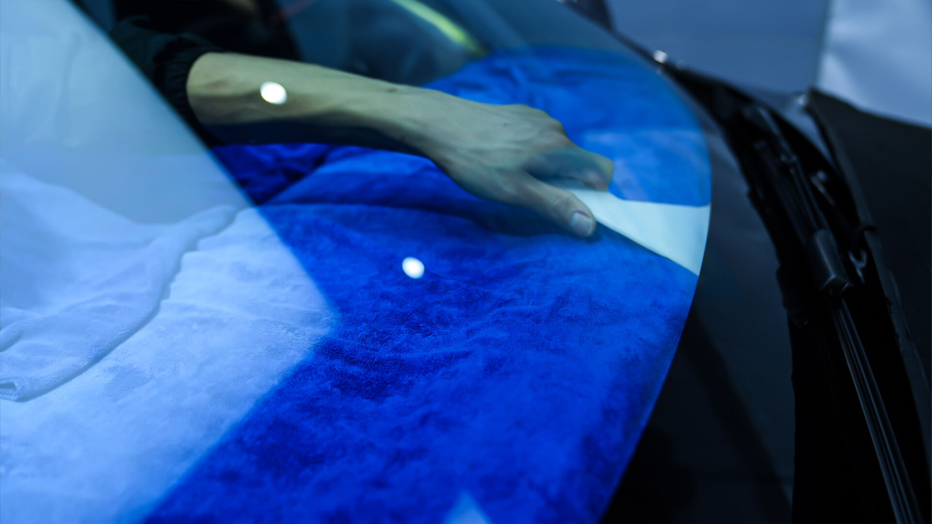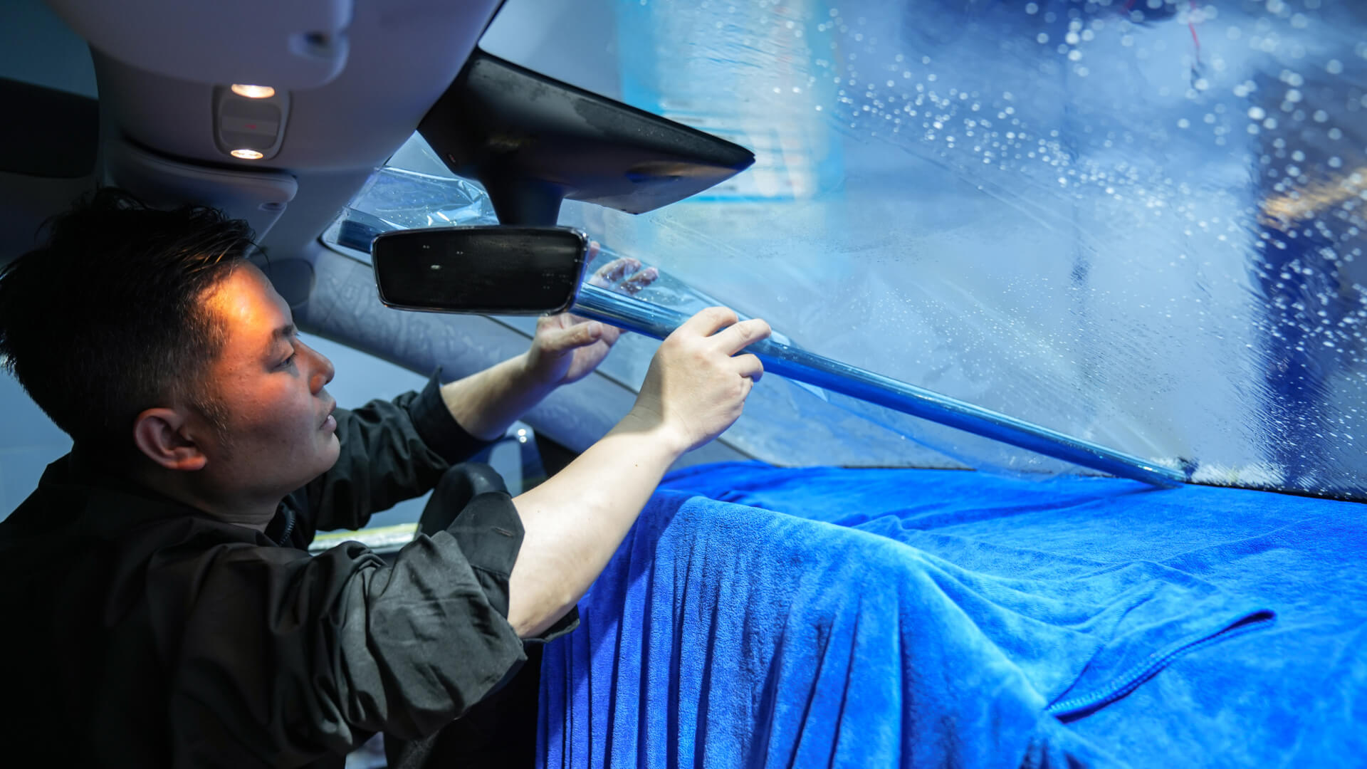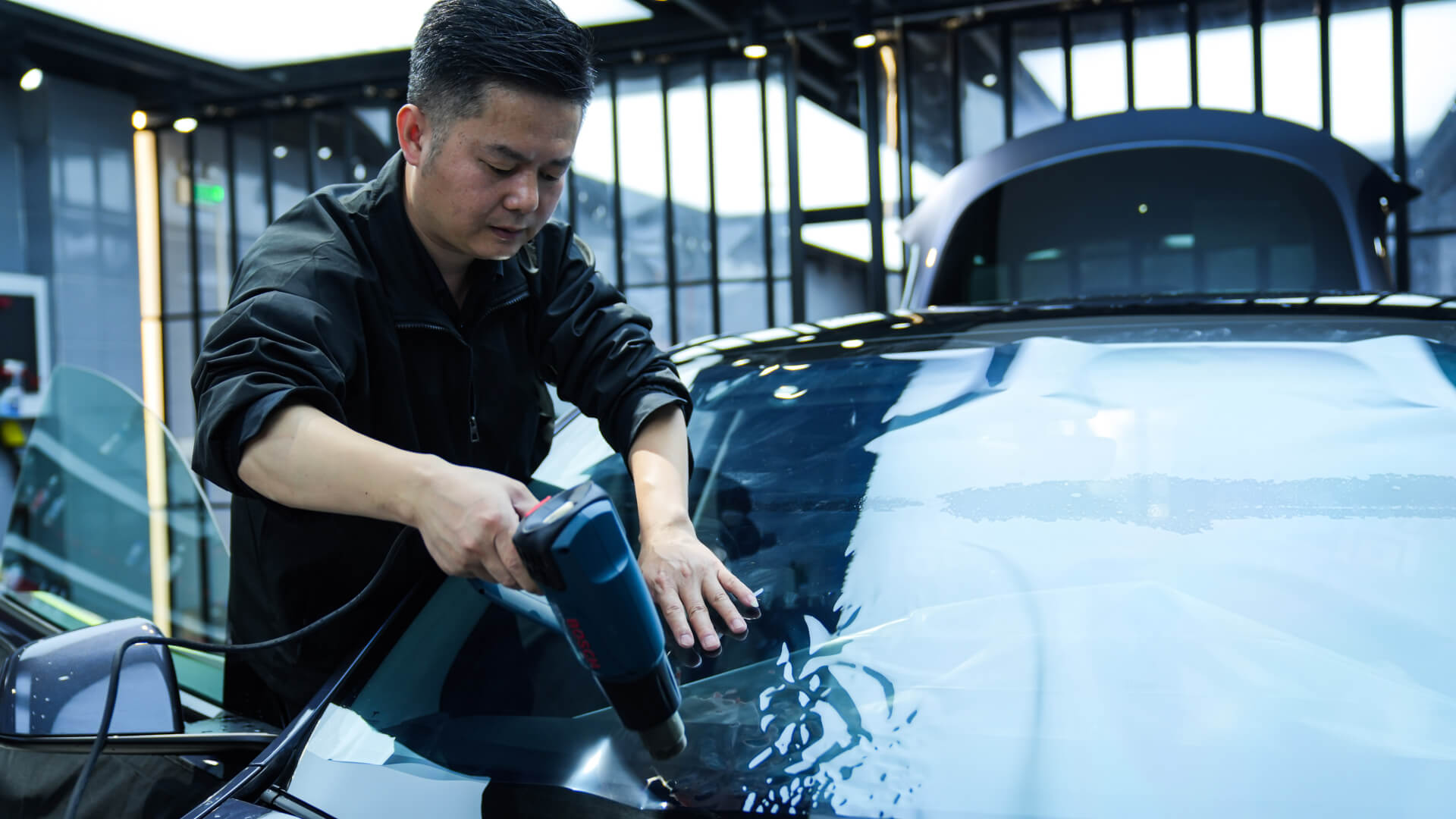 7. 微距施工:技师巧妙地将膜贴附至玻璃边缘,几乎不留任何接缝,显著提升车辆整体美观度。