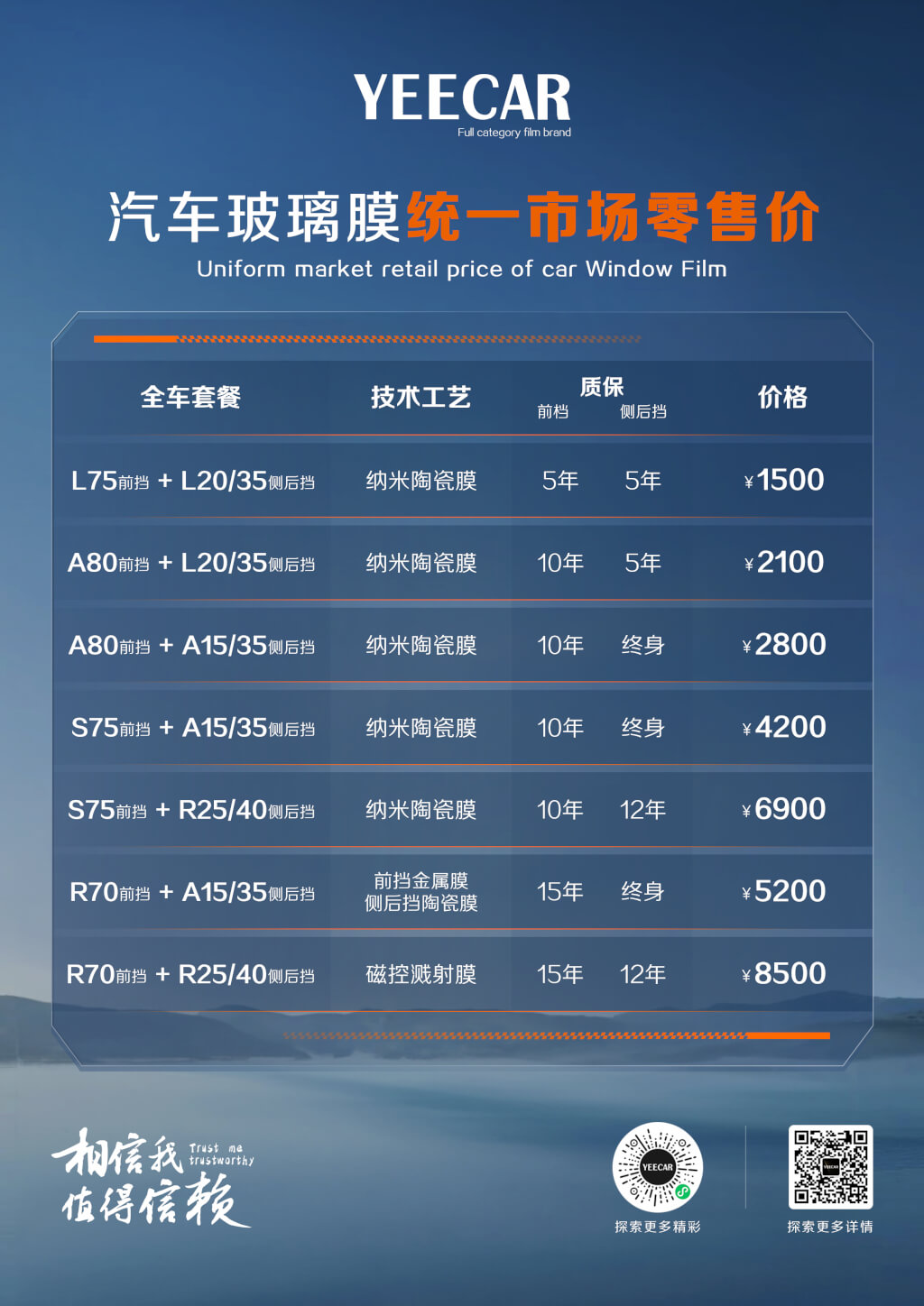 如果是全车贴膜,有以下几种常用的贴膜搭配,YEECAR艺卡全车贴膜价格如下所示: