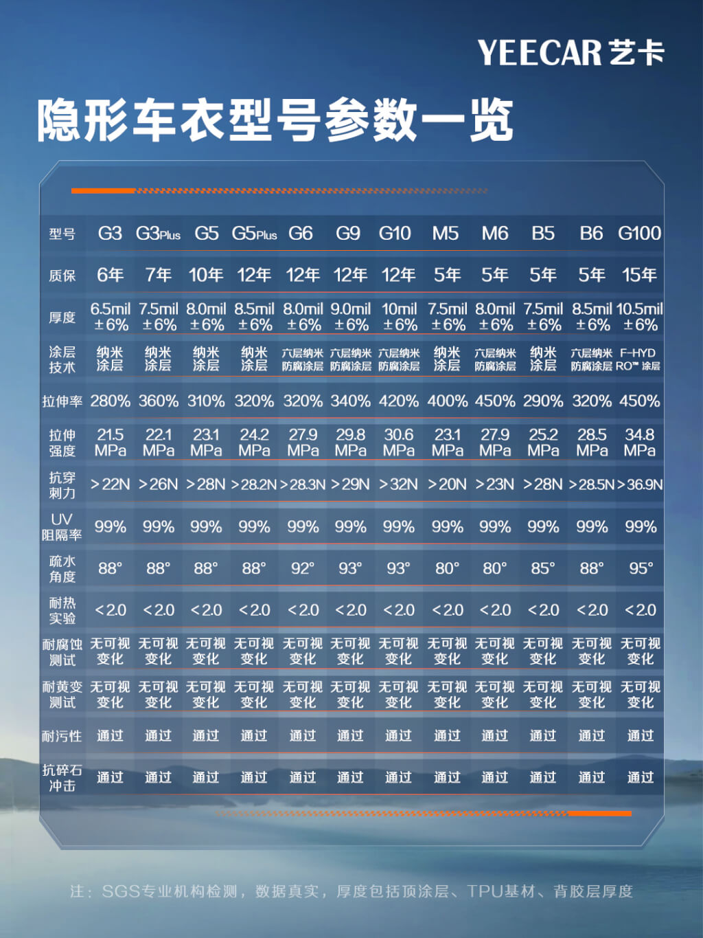 YEECAR汽车玻璃膜(又叫车衣)拥有长效耐黄变、抗刮耐磨、防腐蚀、自修复等性能,具体型号参数如下所示:
