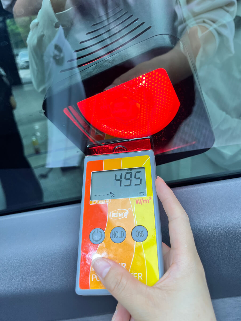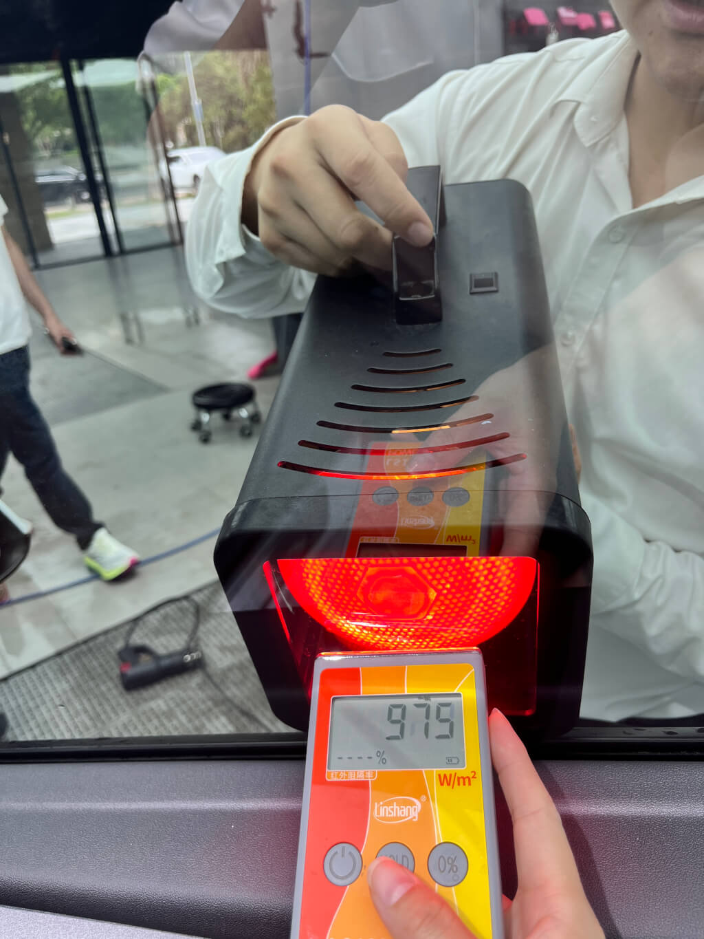主副驾玻璃已贴艺卡A35后测试数据为975w/㎡: