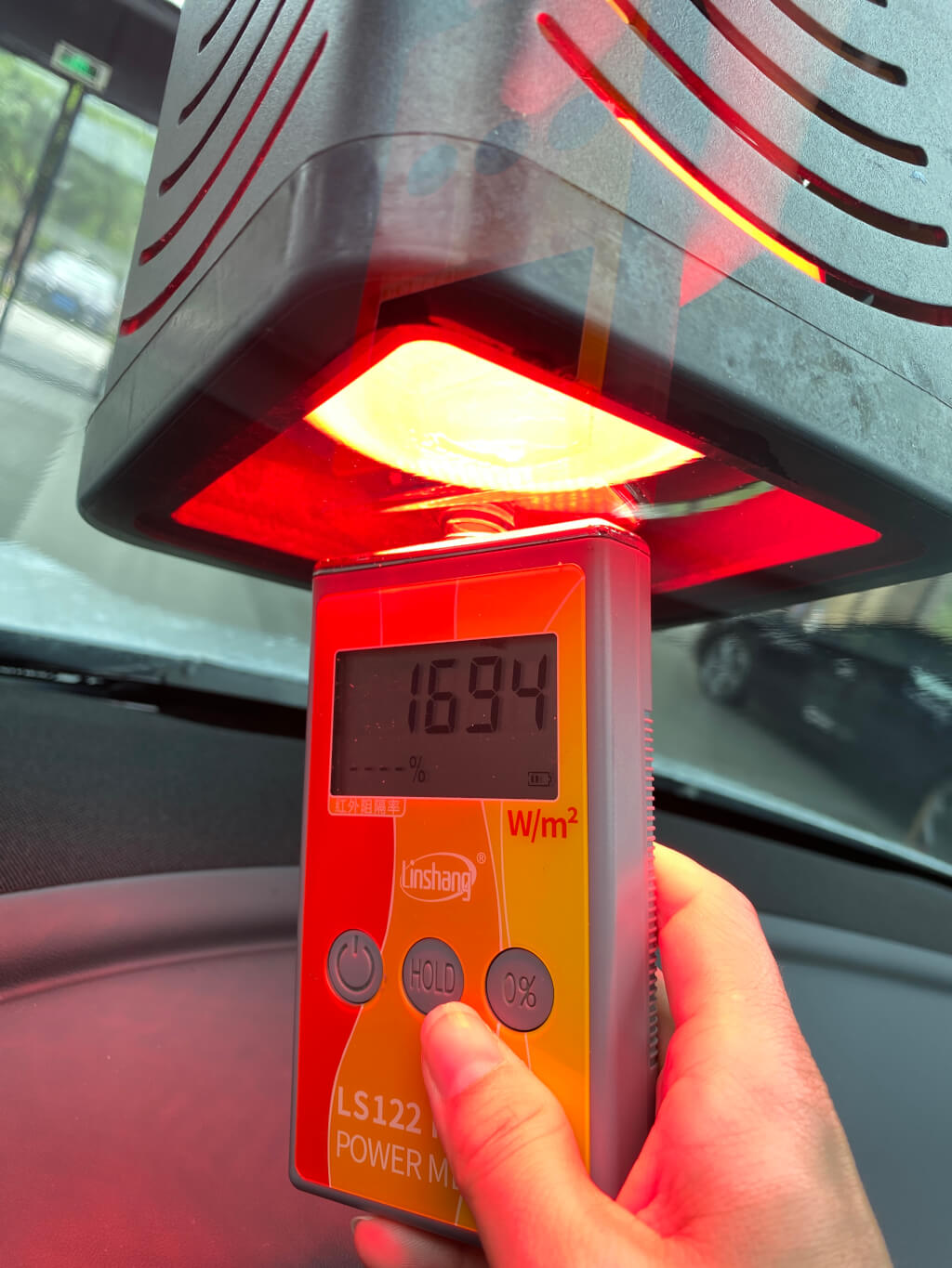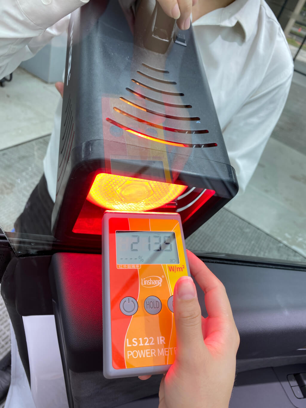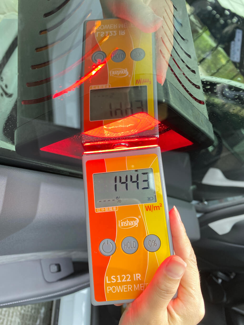 使用的红外发射仪来测试下特斯拉Model Y汽车玻璃的红外热量,测试结果如下: