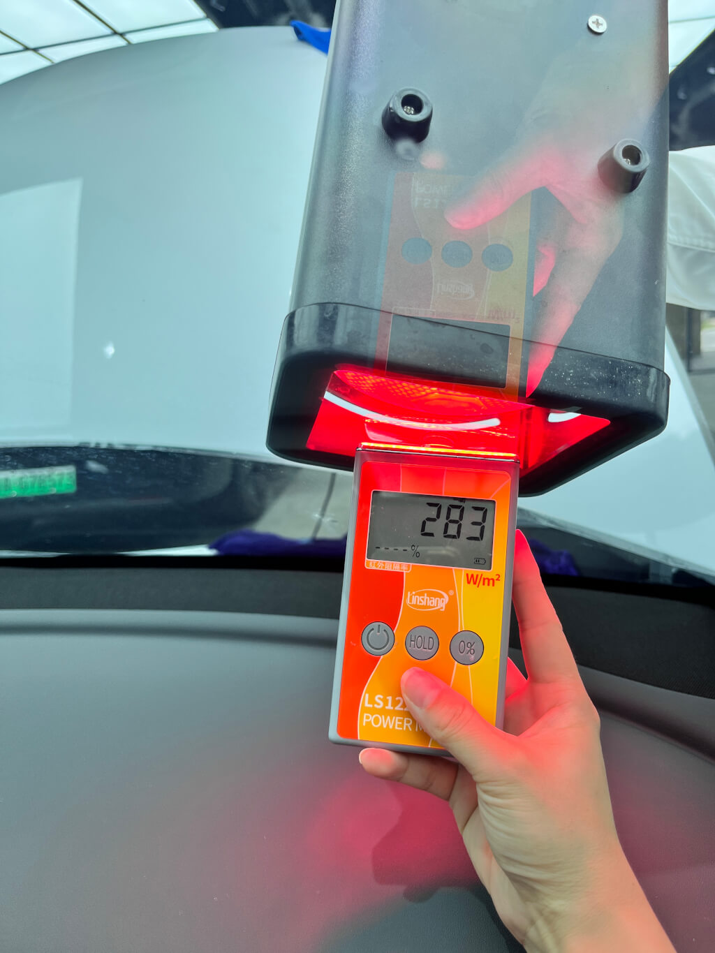 前挡玻璃贴艺卡R70后测试数据为283w/㎡