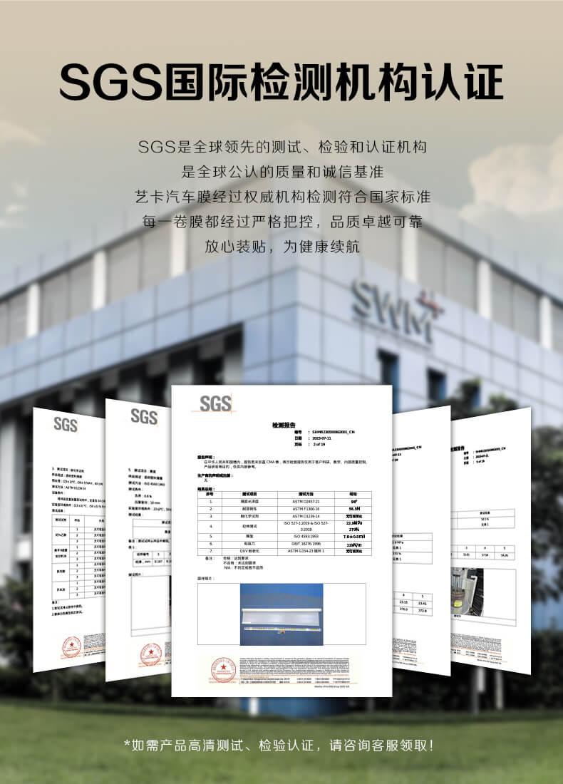 6. 品牌和认证:选择知名品牌的汽车膜产品,这些产品通常经过严格的测试和认证,其所标注的性能指标更具可信性。同时,应查看是否具备相关的质量认证或性能测试报告,以确保产品质量。如艺卡汽车膜经过SGS国际检测机构认证,品质有保障。