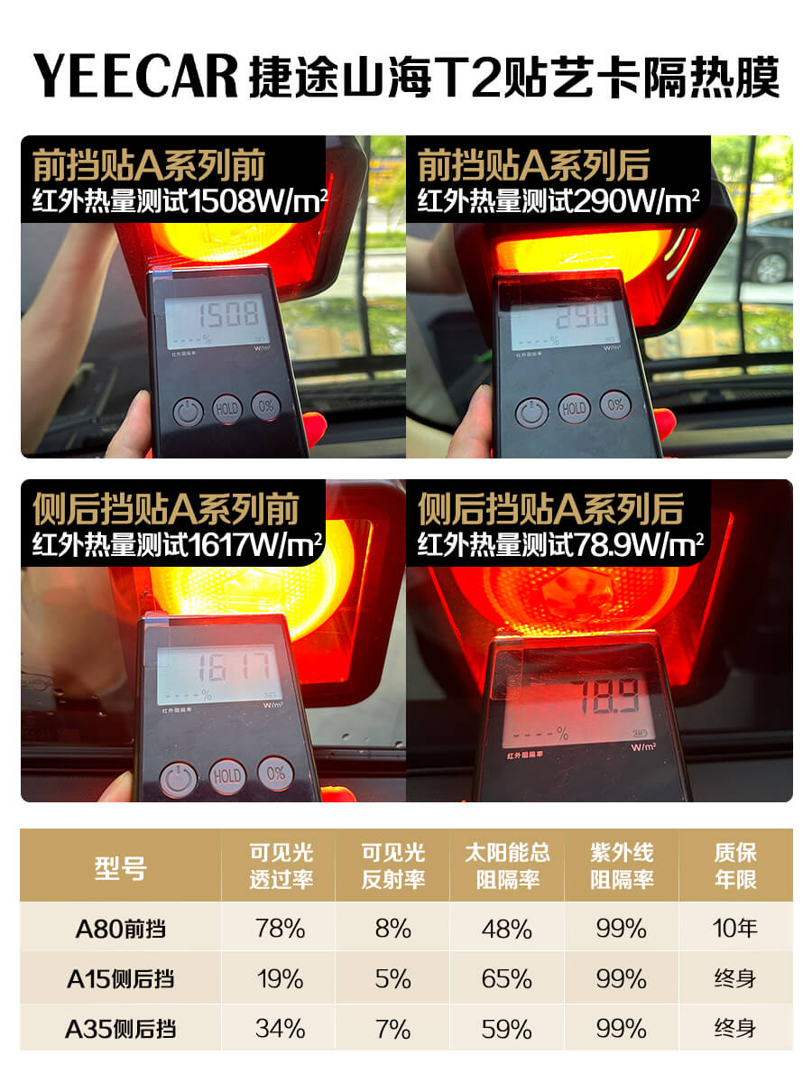 建议价位约2000元左右的车窗膜,价格实惠,防护性能日常使用也已足够。如YEECAR艺卡A系列全车贴膜,价格大约2580元左右,全车纳米陶瓷膜,前挡A80阻隔率高达48%,质保10年,侧后挡A15/35可享受终身质保,综合来说还是非常实惠的。