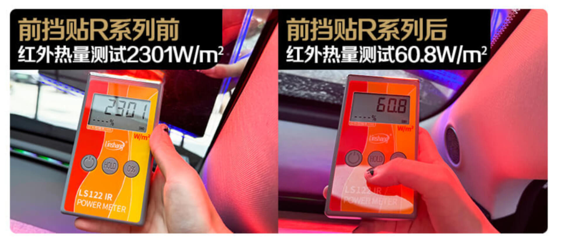 如图,奔驰GLS450前挡风玻璃贴艺卡R70隔热膜,未贴膜前测试热量数据为2301W/㎡ ,贴完艺卡R70后测试数据为60.8W/㎡ ,直接下降2240.2W/㎡,隔热效果非常明显。