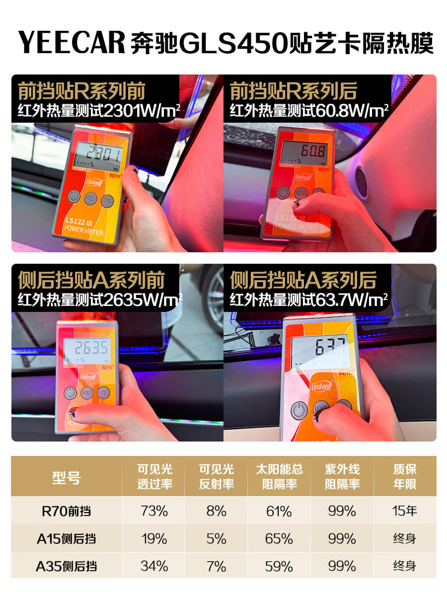 由上述实测图片中可以看出,艺卡隔热膜大大降低了车内的红外线,成功阻隔了太阳中的大量热量。A80+A15/35、R70+A15/35和S75+A15/35均是YEECAR艺卡旗下热门的全车隔热膜系列,隔热性能非常强劲,深受广大车主的喜爱。