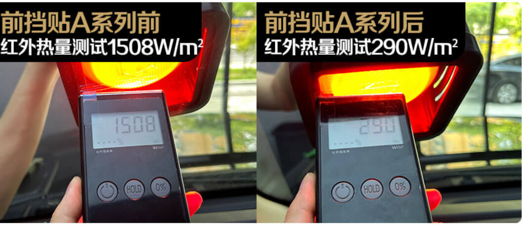 如下图所示,艺卡R70前挡汽车膜贴前贴后的测试数据如下,R70的太阳能总阻隔率高达61%,属于高性能隔热膜,隔热效果非常好。