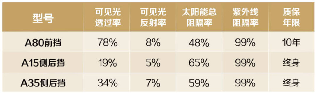 如图,A系列的侧后挡汽车膜中,浅色膜A35的太阳能阻隔率为59%,深色膜A15的太阳能总阻隔率为65%,数据相差并不大,隔热效果相差也不大。