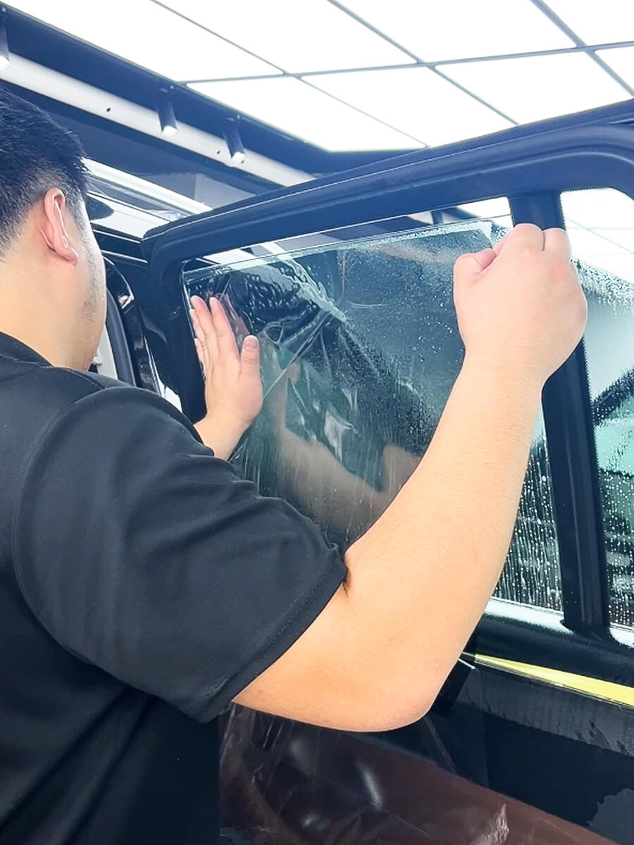 7. 微距施工:技师巧妙地将膜贴附至玻璃边缘,几乎不留任何接缝,显著提升车辆整体美观度。