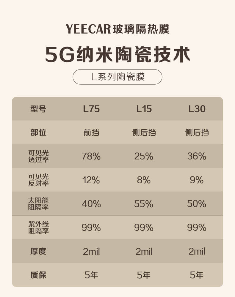 如艺卡L系列吗,为纳米陶瓷膜,价格实惠,贴完全车只要1880元左右,不到两千元即可。其前挡L75的太阳能总阻隔率为40%,足够满足日常出行使用,质保 5年,综合性价比非常高。