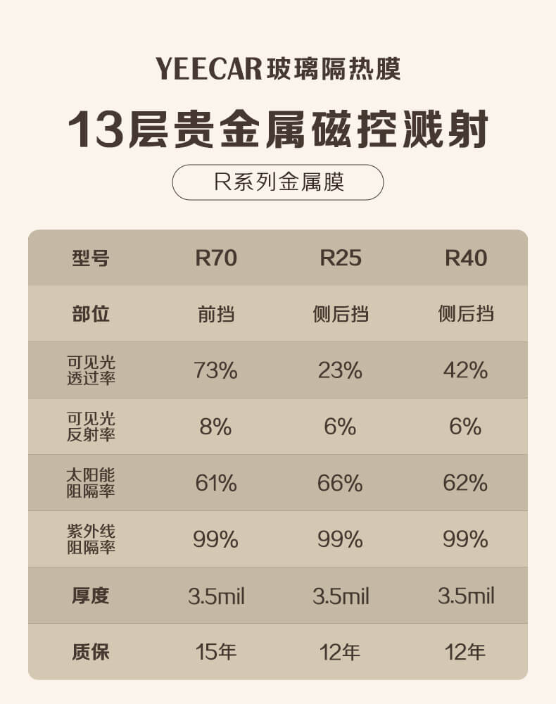 如艺卡全车R系列太阳膜,采用13层贵金属磁控溅射工艺制作而成,其太阳能总阻隔均高达60%,实现全车超强隔热,非常适合炎热地区使用。