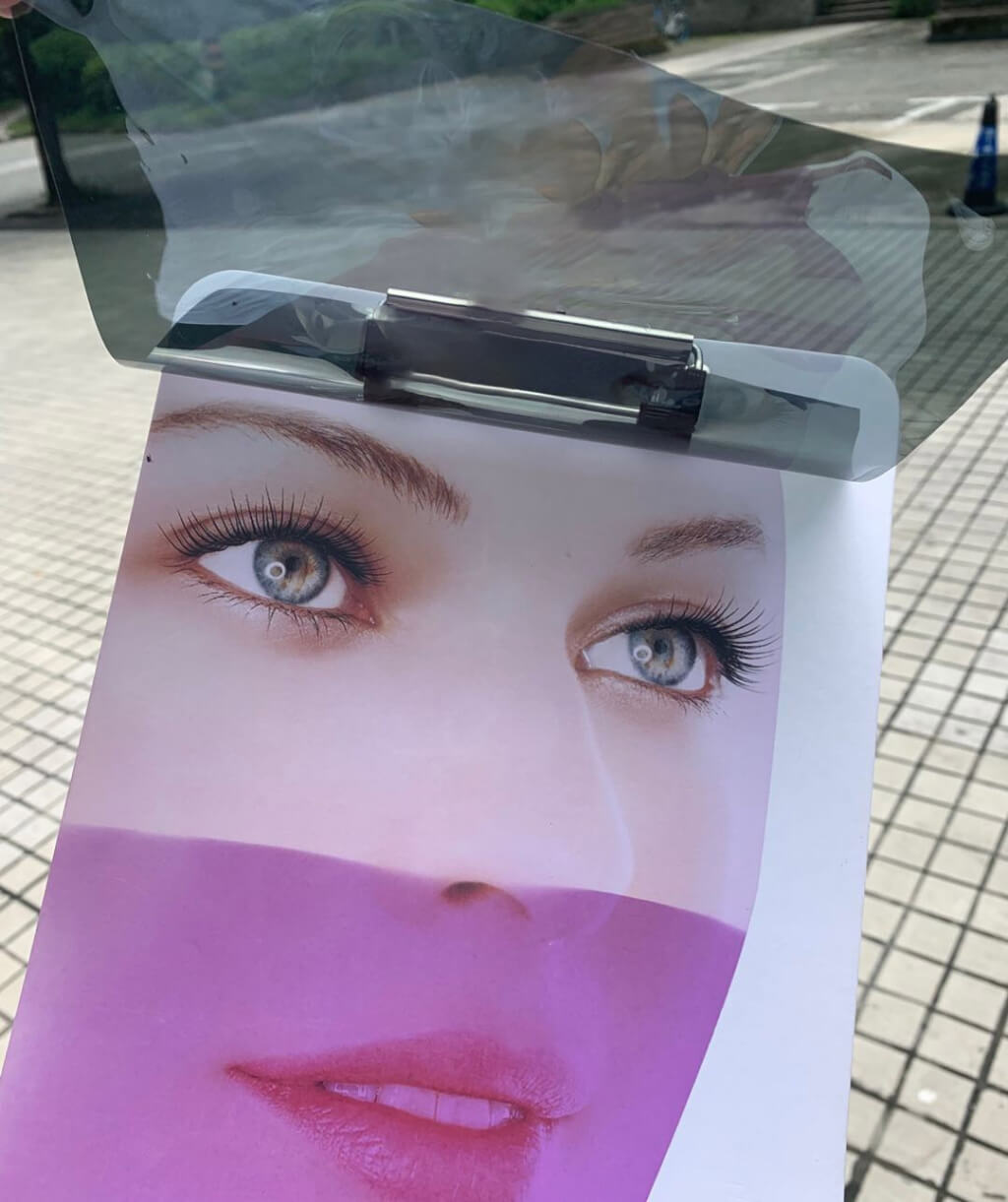 下图为用紫外线试纸的户外测试。人脸图片的上半部分用了艺卡膜阻隔阳光,没有被紫外线晒到变紫;下半部分没有用艺卡膜遮挡,被太阳光中的紫外线晒成紫色。两部分对比明显,说明艺卡汽车膜能阻隔大部分的紫外线。