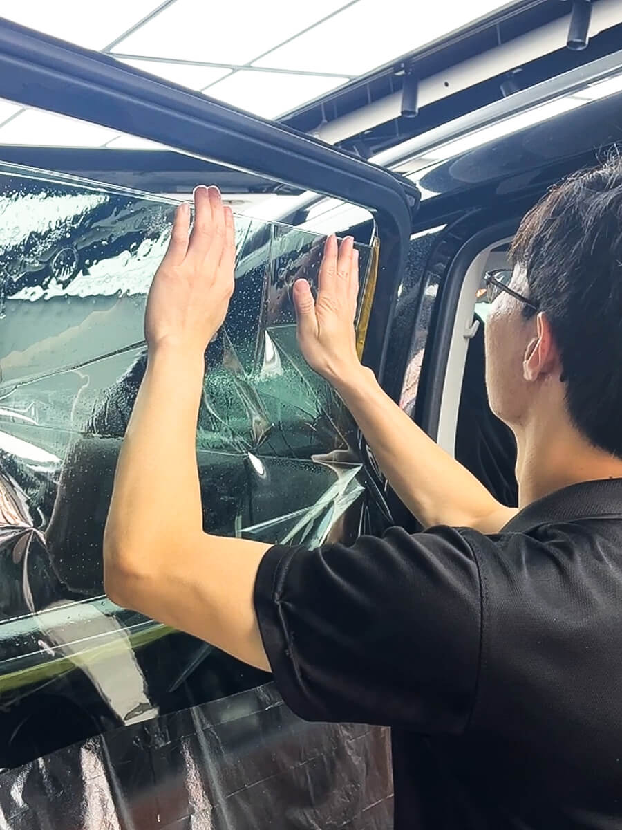 7、赶水施工:仔细将多余的水分赶出去,让膜和车玻璃紧密贴合。
