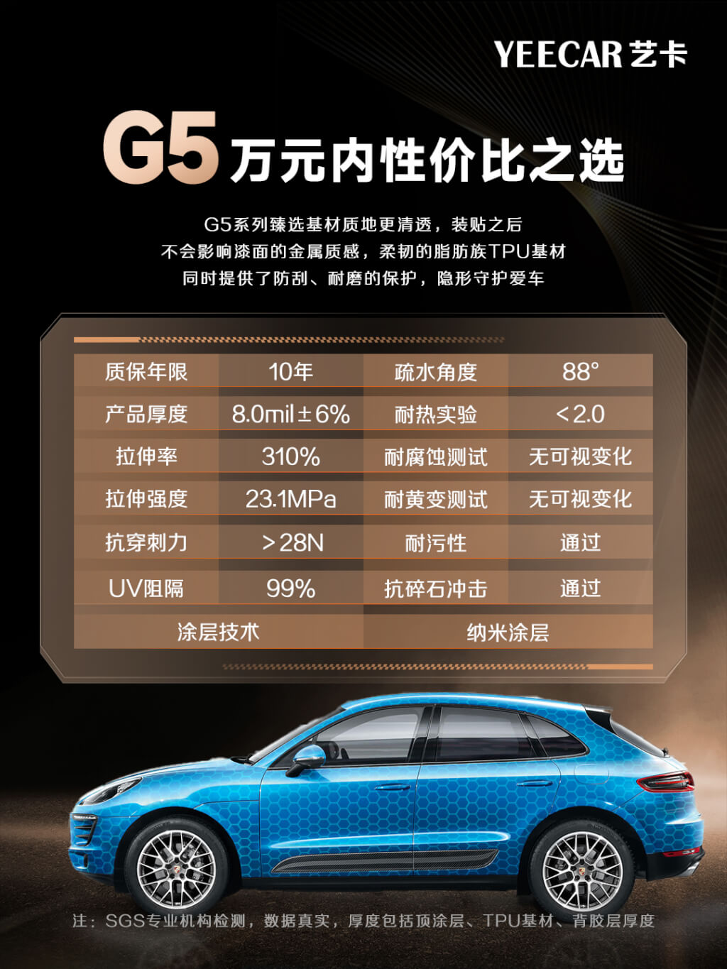 以YEECAR艺卡隐形车衣G5型号为例,基材全部臻选自美国阿古泰克优质脂肪族TPU,厚度达到8mil,长达10年质保,综合性能齐全,价格在8000~9800元左右,如果你真的想贴优质的脂肪族TPU,可以拿这个型号做对比。