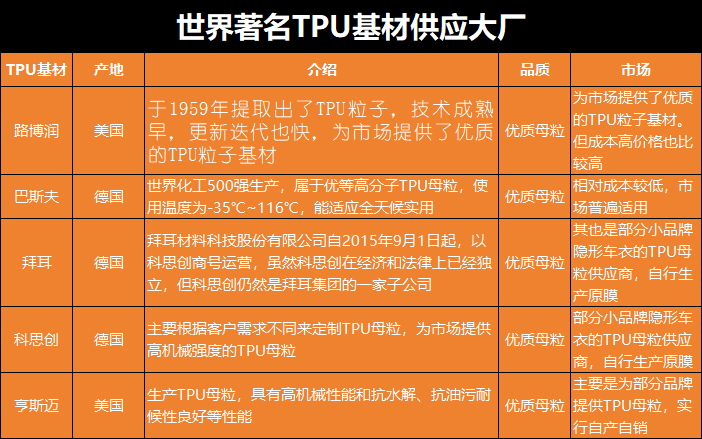 我们要知道,隐形车衣的TPU基膜核心生产技术一直以来被西方大公司封锁,而目前国内外最流行的TPU母粒及原膜供应商几乎是由路博润、巴斯夫、科思创、拜耳、亨斯迈、阿古泰克等大厂供应的。而将TPU颗粒制成TPU原膜技术的厂商里,最具有代表性的就是阿古泰克了,其几乎垄断了95%的市场供应份额,甚至可以说没有哪个汽车膜生产厂家能离开阿古泰克的技术。