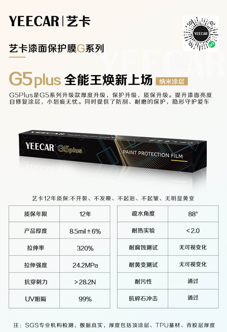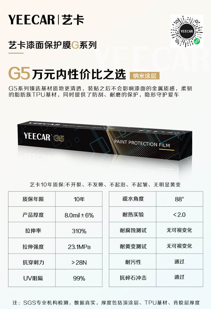 特点:采用高端阿古泰克进口TPU基材和纳米顶涂层技术,光泽度高,抗黄变、抗污、划痕自修复等优点显著。当车辆受到小刮小蹭时,G5隐形车衣的自修复功能让车身恢复如初,避免了昂贵的维修费用。