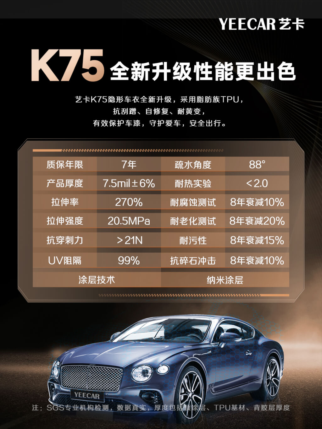 特点:价格亲民,采用脂肪族TPU基材搭配纳米防腐涂层,具备良好的抗刮擦和耐黄变性能,还能有效提亮车漆光泽度达30%。之前有位车主贴了K75之后在高速公路上行驶,车头被小石子击中,来店里我们给他看了一下,隐形车衣下的车漆还是完好无损的。