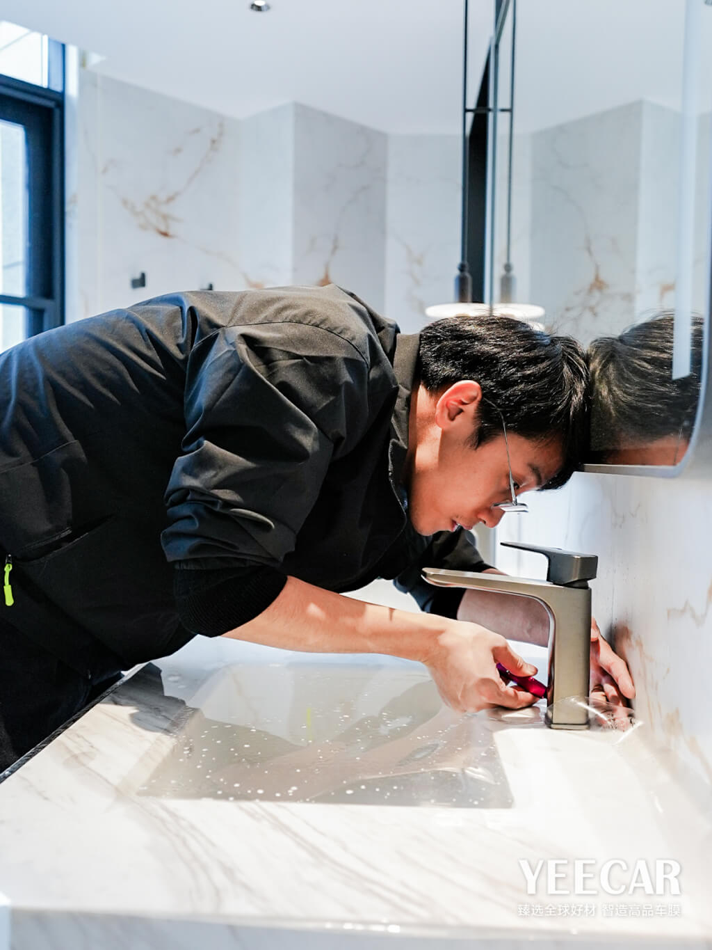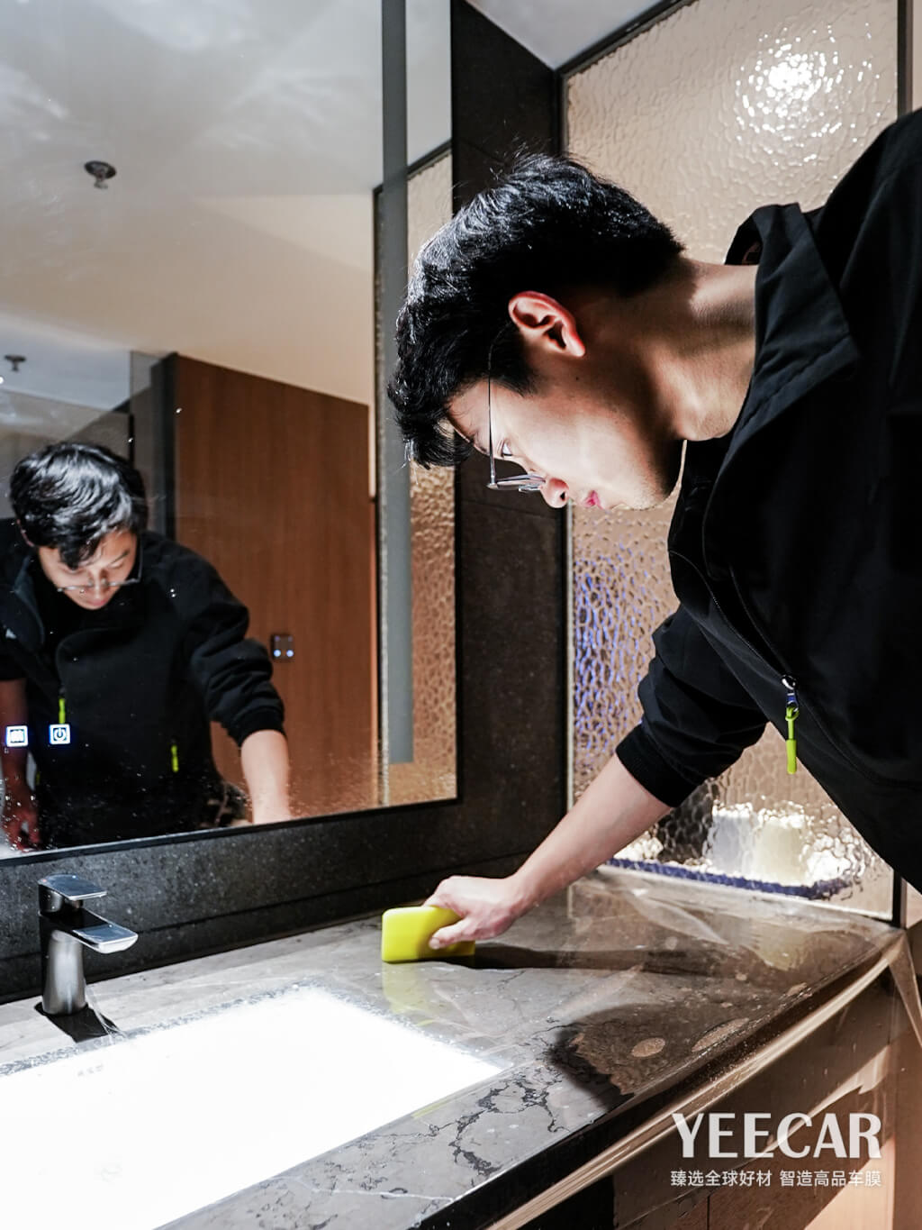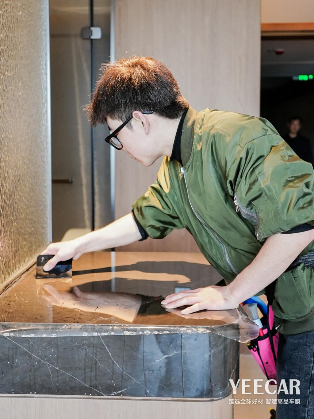 卓越的产品需要极致的工艺来实现其价值。YEECAR艺卡为咏航睿致酒店项目派遣了经验丰富的专业施工团队。师傅们需要在洁净无尘的环境中作业,确保膜体贴合前表面无一粒灰尘。