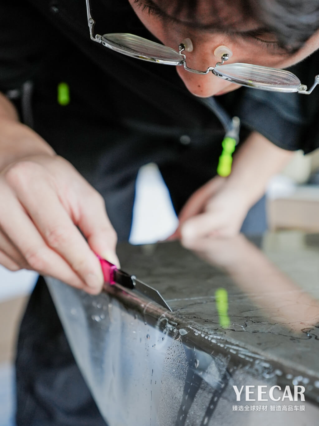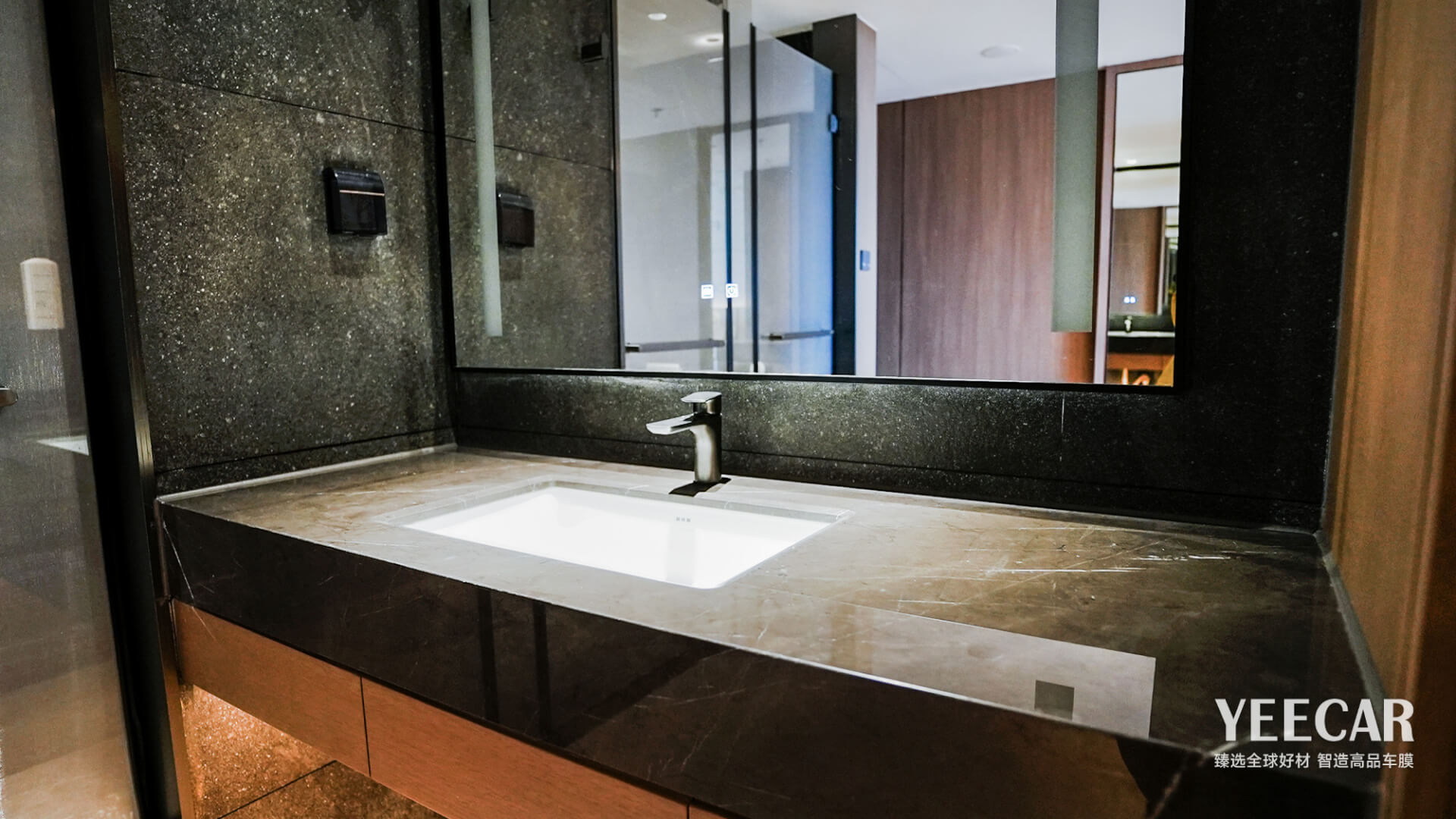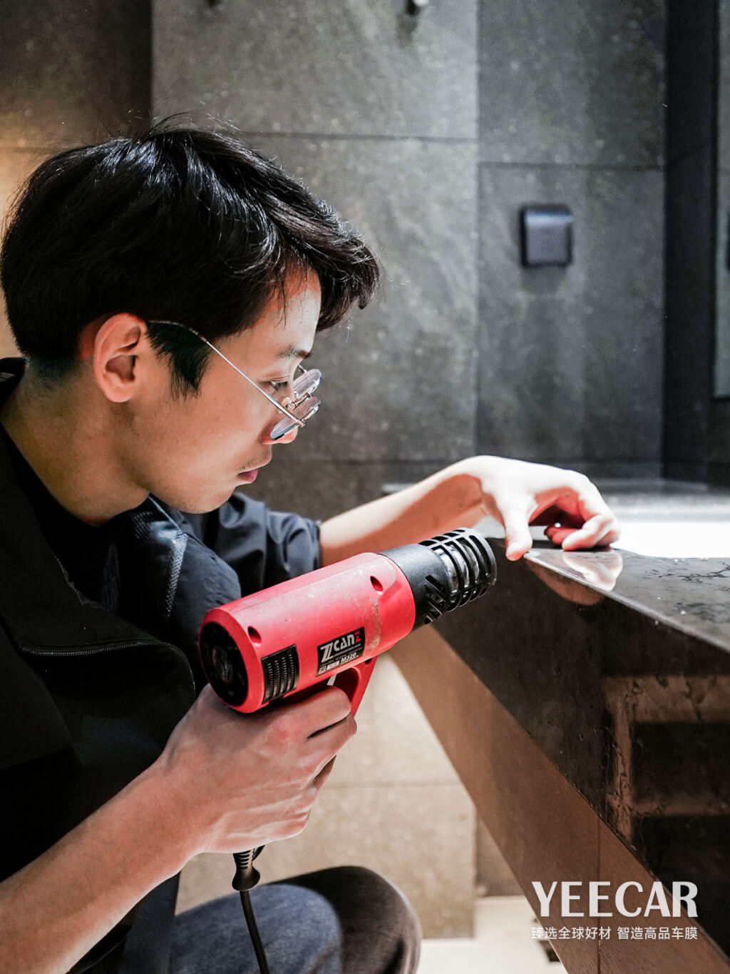 卓越的产品需要极致的工艺来实现其价值。YEECAR艺卡为咏航睿致酒店项目派遣了经验丰富的专业施工团队。师傅们需要在洁净无尘的环境中作业,确保膜体贴合前表面无一粒灰尘。