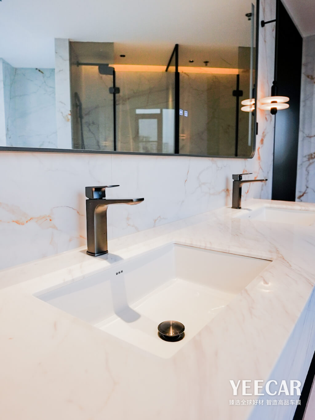对于酒店内造型不一、带有边角和弧度的陶瓷台盆与桌面,艺卡采用专案专用的精准裁膜技术。通过预先精确测量和电脑裁切,确保膜体与台面边缘完美契合,实现包边覆盖,达到真正的“隐形”效果。